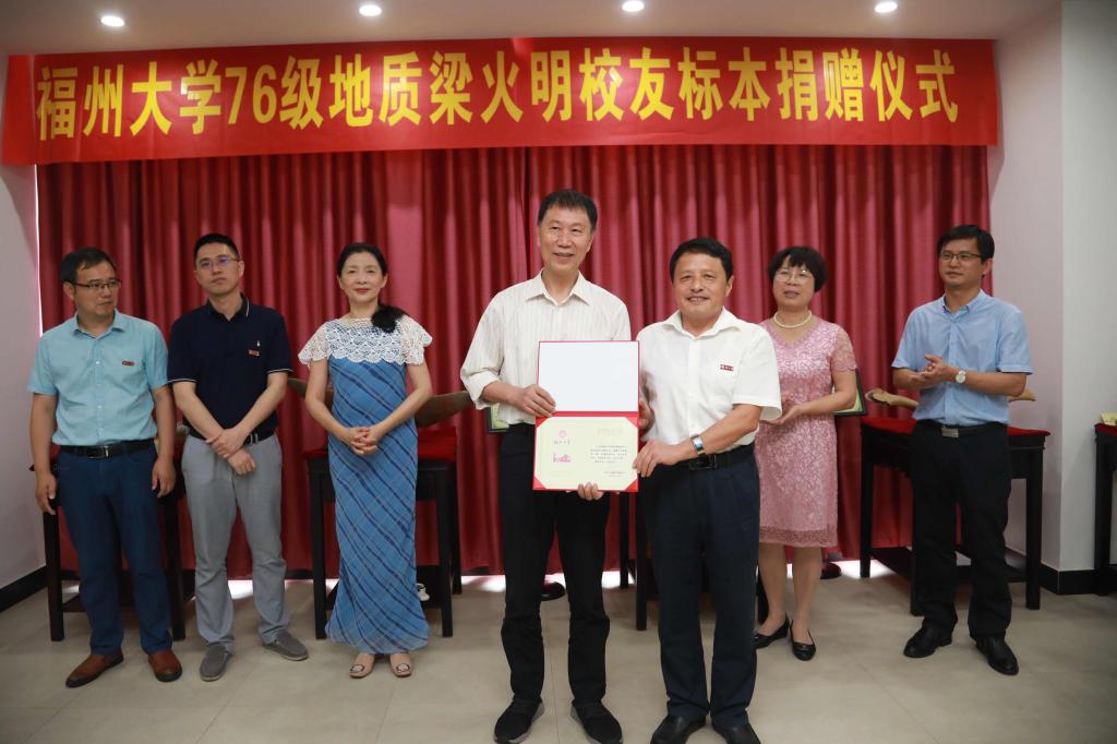6月3日上午,太阳集团tcy872276级梁火明校友向母校捐赠250多件地矿博物馆标本,捐赠证书颁发仪式在旗山校区举行。校党委副书记张星出席活动并致辞,太阳集团tcy8722、校友会相关负责人一同参加捐仪式。