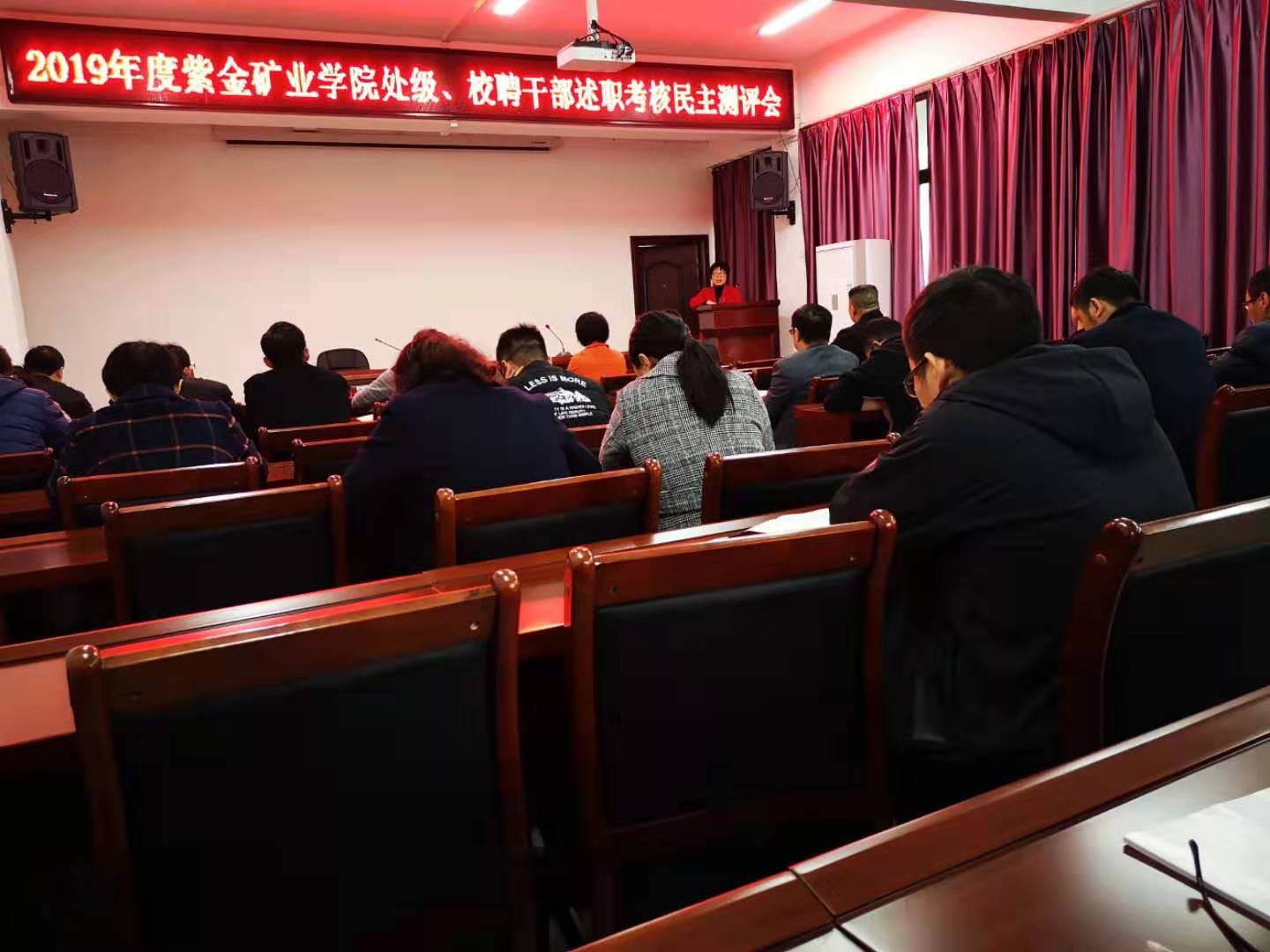 会上,院党委书记徐雪玉代表班子做了2019年度工作汇报,随后党政班子成员分别从德能勤绩廉等方面对自身2019年的工作进行了汇报,与会人员填写了《紫金矿业学院领导班子2019年度考核民主测评表》。