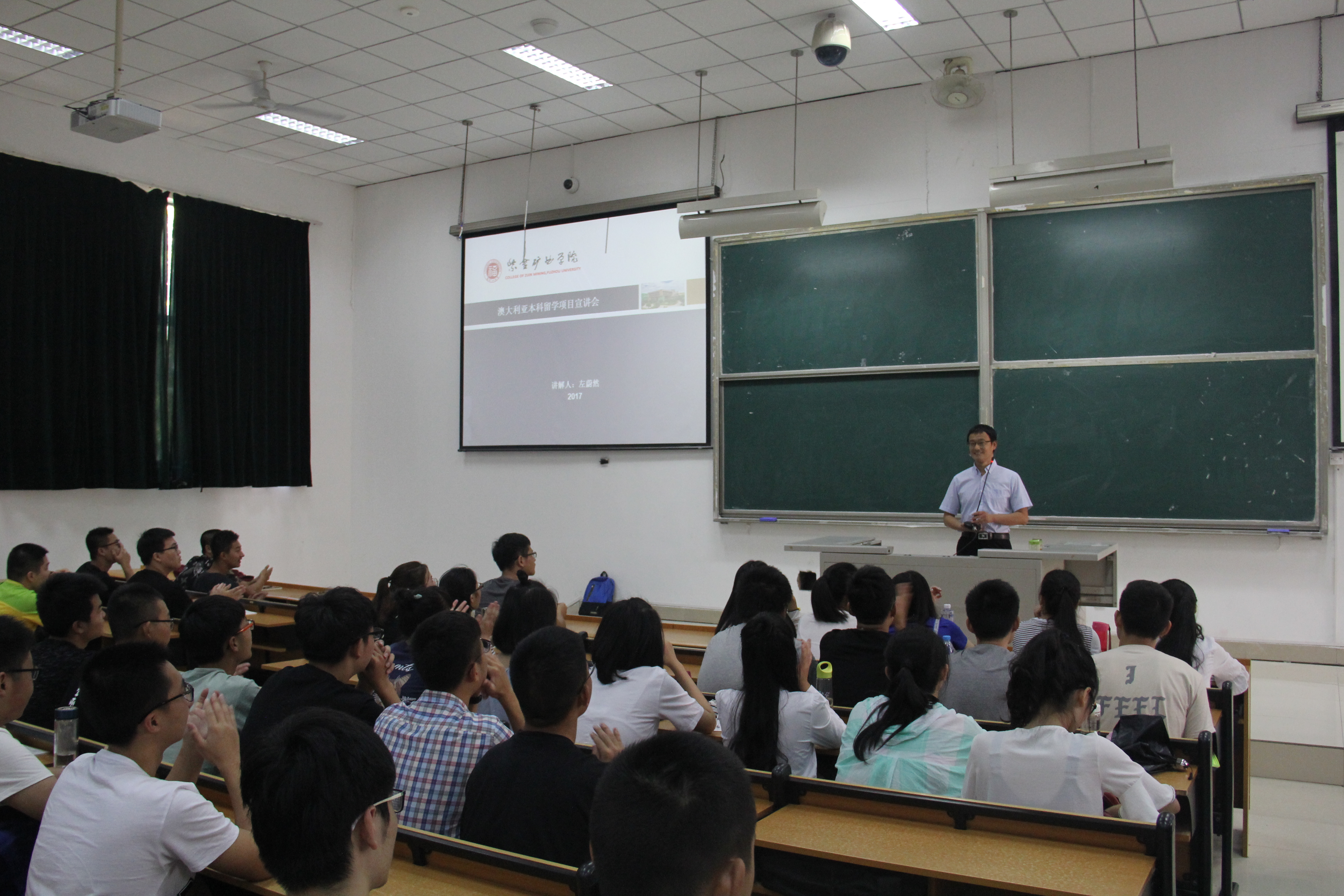 会上,左老师首先介绍了我院国际化办学概况,指明了学院未来国际合作项目的重点和发展方向,使学生对学院国际化办学方针、政策及方向有了概括性的认识。接着,左老师介绍了学院现有的采矿工程专业“2+2.5”联合办学项目、矿物加工工程专业本科双学位项目和“3+1+X”本科生/研究生项目以及每个项目的学习模式、学位颁发、招生时间、报名资格、学杂费等方面的细节。随后,左老师对托福和雅思考试做了简单介绍,帮助学生分析了雅思和托福考试的区别,对学生选择哪种考试、何时参加考试提出了较好的建议。