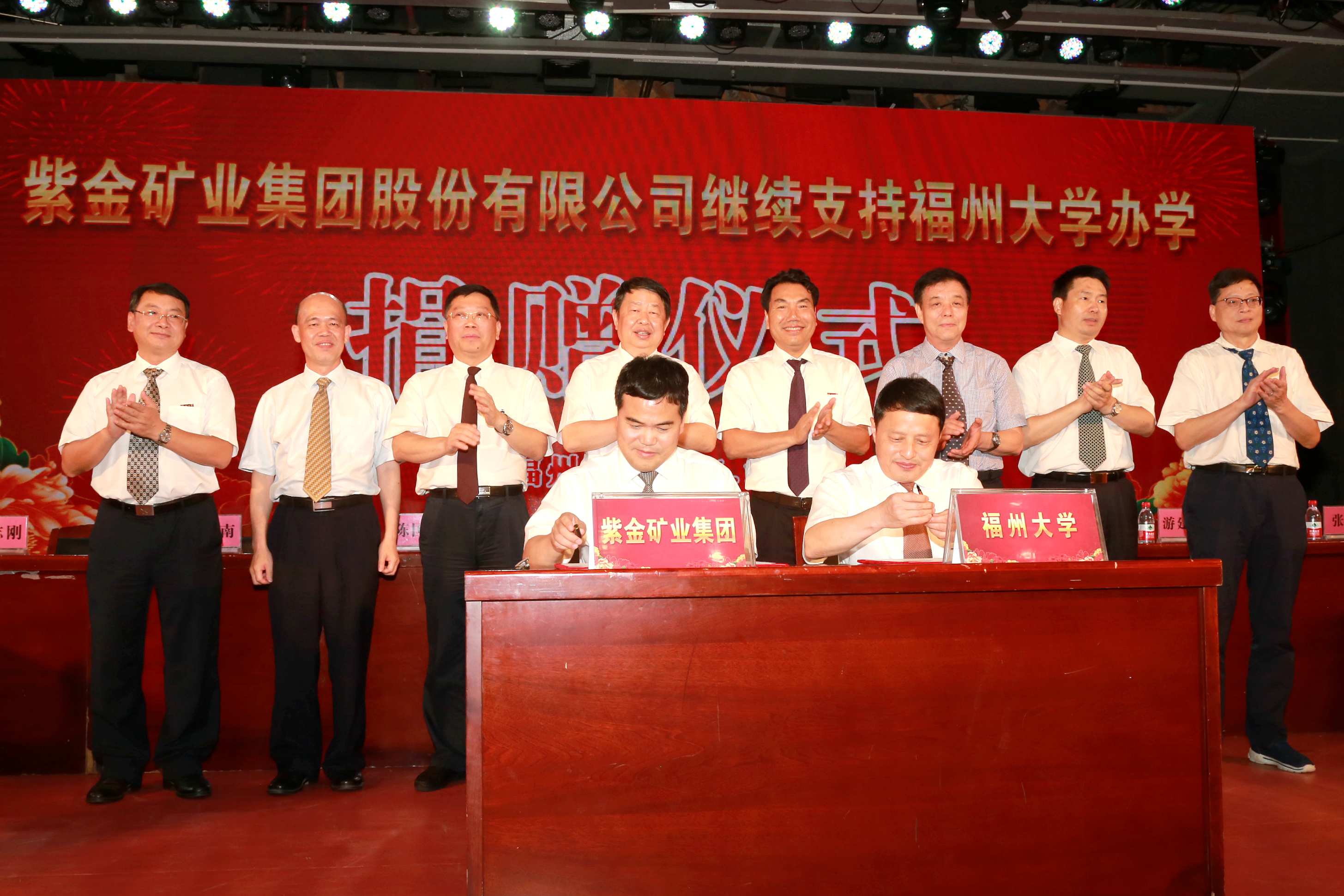 仪式由学院党委书记黄培明主持。张星副校长和郑友诚董事长助理代表校企双方签约,全场嘉宾共同见证紫金矿业集团继续捐赠2000万人民币支持我校办学。