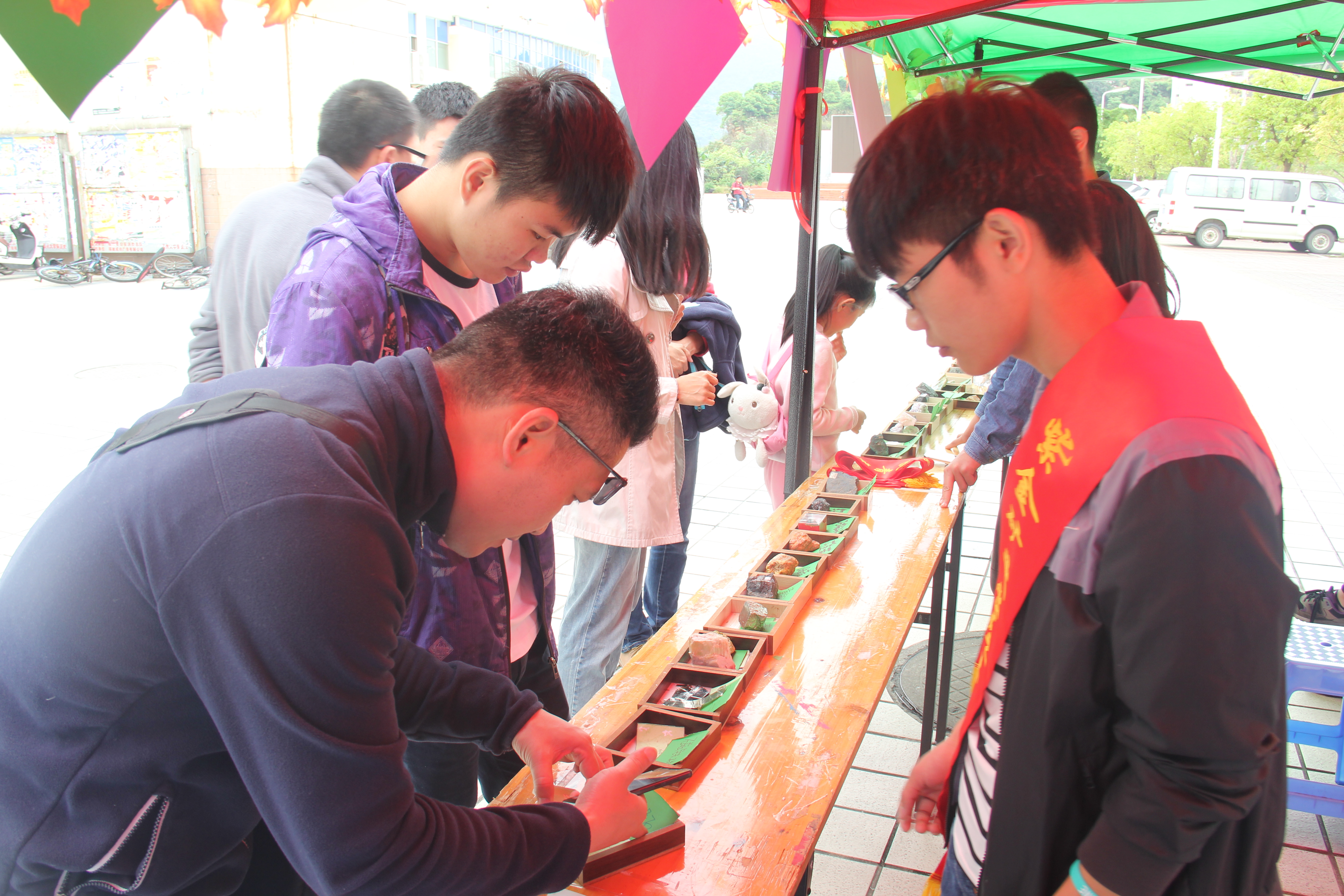2017年4月22日上午,紫金矿业学院于青春广场上举办了地矿风采展,挑选出精美矿石,化石等供学生参观,并由我院学生代表在一旁悉心讲解。本次地矿风采展吸引了大量学生前来,并通过多样的展品和详细的讲解使他们对此产生了浓厚的兴趣,同时借由精美的矿石化石和印章等,很好的宣传了地质学的相关知识,普及了相关的地质文化。在风采展即将结束之时,我院负责人宣布我院地藏博物馆将在特定时段开放,反响热烈,受到了广大学子的支持。