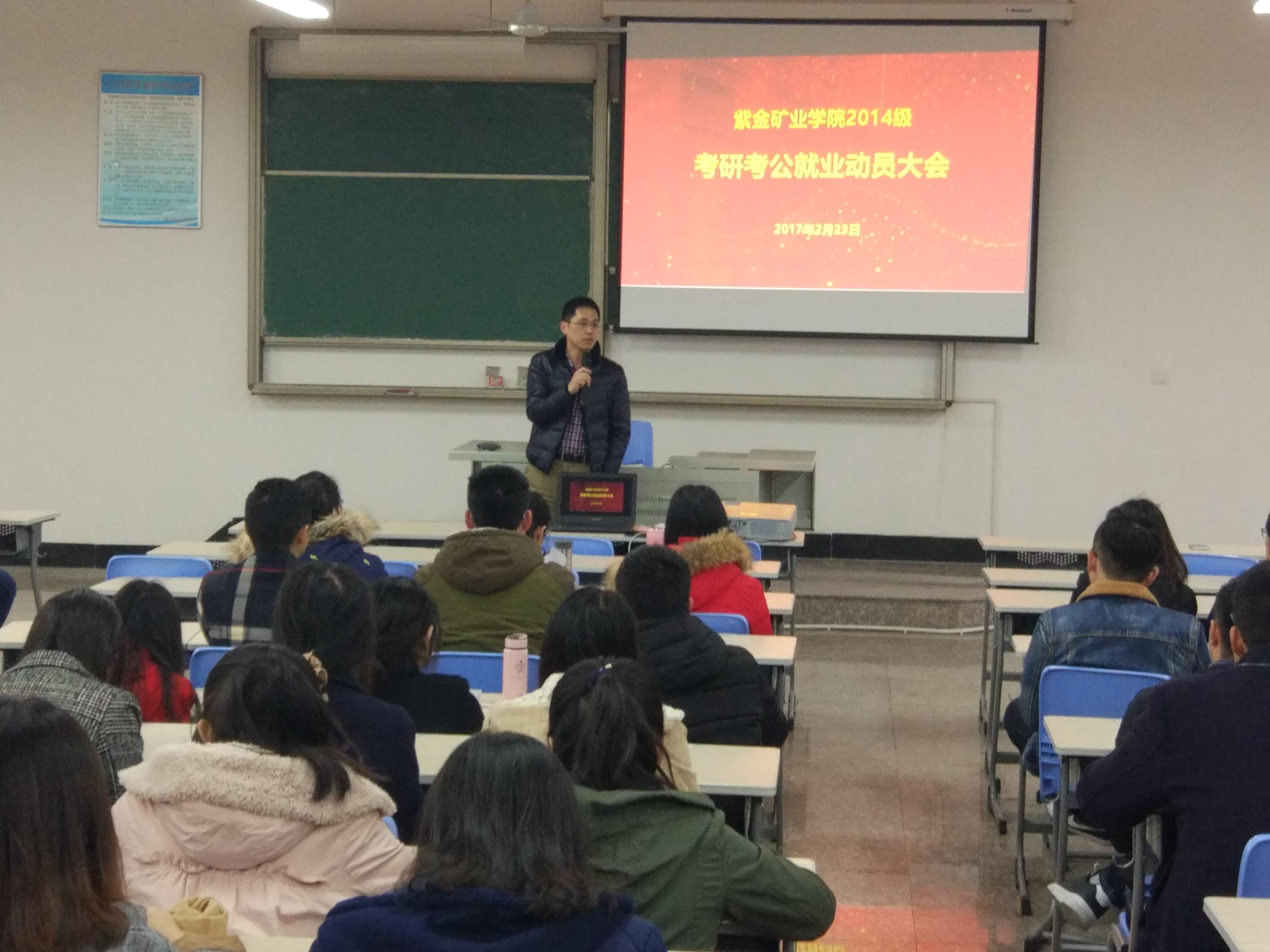 2月23日下午,2014级考研考公与就业动员大会在上杭教学基地综合楼501召开,旨在帮助我院大三同学及早了解就业形势,明确目标,增强信心。2014级全体同学参加大会,院党委副书记郑寿出席动员大会,大会由辅导员王聪聪主持。
