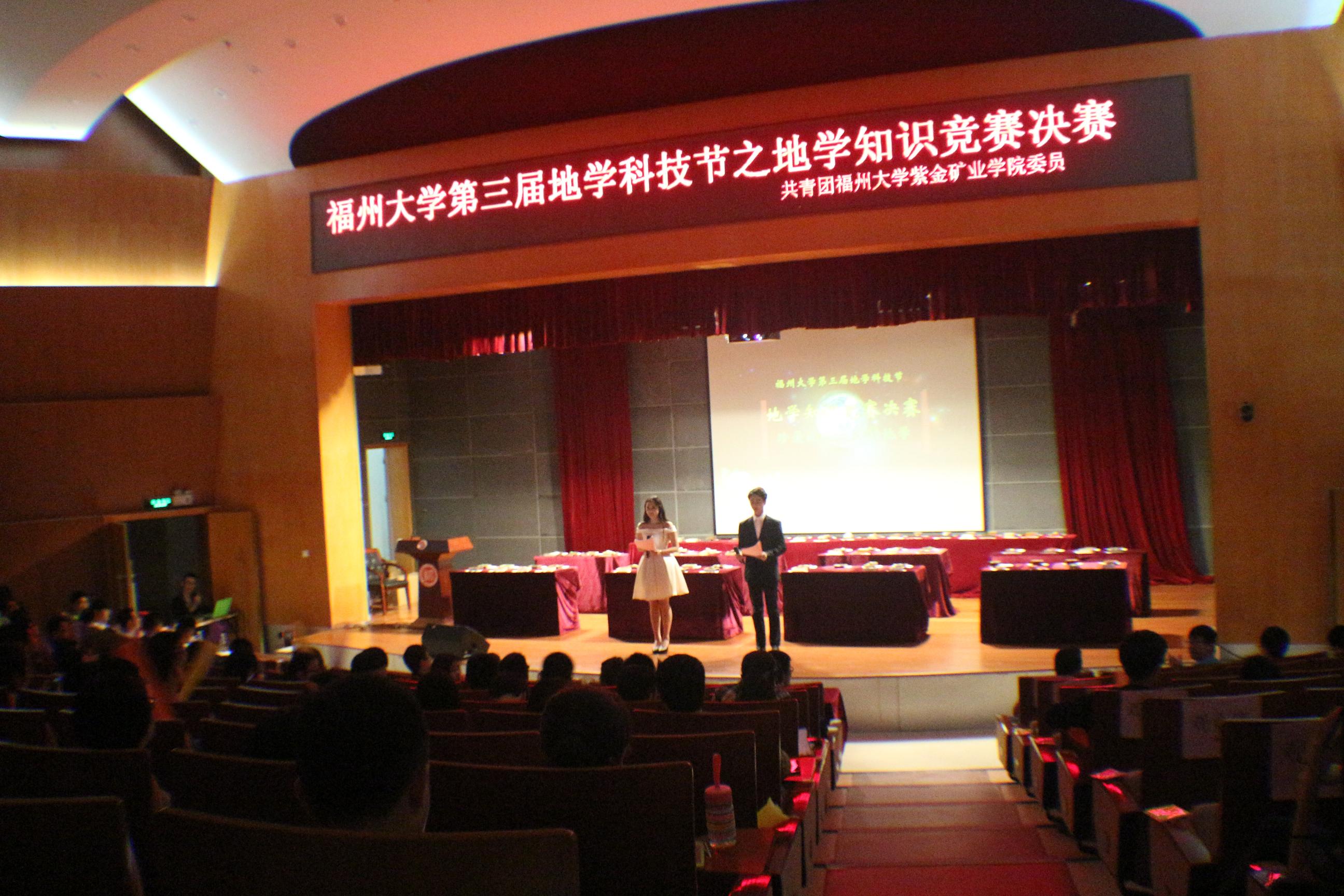 此次地学知识竞赛分初赛和决赛两个阶段。通过初赛的笔试,共选取了八队笔试队伍进入决赛。决赛分为“寻宝石,爱答题”两个环节,在“寻宝石”环节中,各支队伍需要在寻宝之前抽取装有相关信息的信封,并在两分钟之内阅览完毕。寻宝开始后,参赛队伍进入寻宝区“寻宝”,即寻找图片中对应的矿石,并在矿石所在区域做上标记。每支参赛队伍都争分夺秒而又有条不紊地进行着寻宝活动,现场气氛紧张激烈。当工作人员宣布寻宝结束时,寻宝队伍必须迅速撤出寻宝区。在本轮竞赛中,经管学院的午时风队,紫金矿业学院的小二郎队全部答对,分数并列第一。随后是“爱答题”环节。本环节分成三轮,首轮为必答题,各个队伍均需回答十道题,答对加5分,答错不扣分。首轮各个队伍势均力敌,分数相当。第二轮为抢答题,答对加10分,答错扣10分,题目难度相对必答题有了明显的提高,各队之间分数渐渐有了差距。第三轮为决胜局,皆为难度系数较高的题型,参赛队伍可选择是否继续进行,对于在一分钟之内回答出的队伍给予10、20、30、40四种等级的奖励,反之则扣除相应分数。