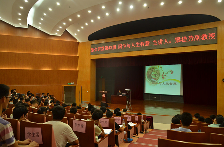 9月24日下午2:30,第42期“紫金讲坛”在校图书馆明德厅举行,本次讲坛嘉宾邀请了我校人文社会科学学院副院长梁桂芳副教授主讲,我院学生、老师以及学院彭向东副院长、院党委余飞副书记等200多人参加。