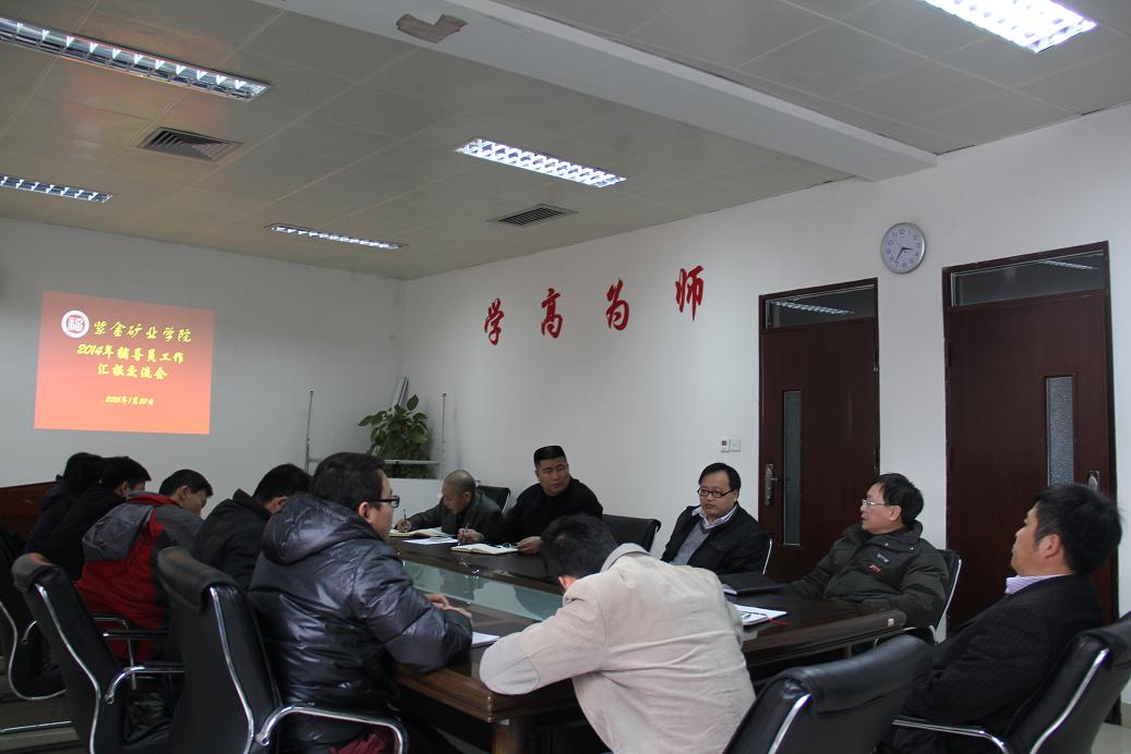 2015年1月20下午,紫金矿业学院2014年度辅导员工作汇报交流会在院北206会议室举行,刘羽院长、黄培明书记、余飞副书记、印万忠副院长、彭向东副院长等领导及专业班导师参加了交流会并听取了辅导员们的汇报。