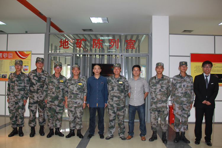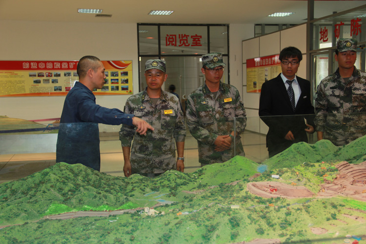 2014年10月26日下午4时许,2014年太阳集团tcy8722新生军训团团长王明星中校、参谋长廖帅狮少校一行在我院党委副书记余飞、院团委书记兼2014级辅导员李金土的陪同下参观了我院地矿陈列室和矿业模型展厅。