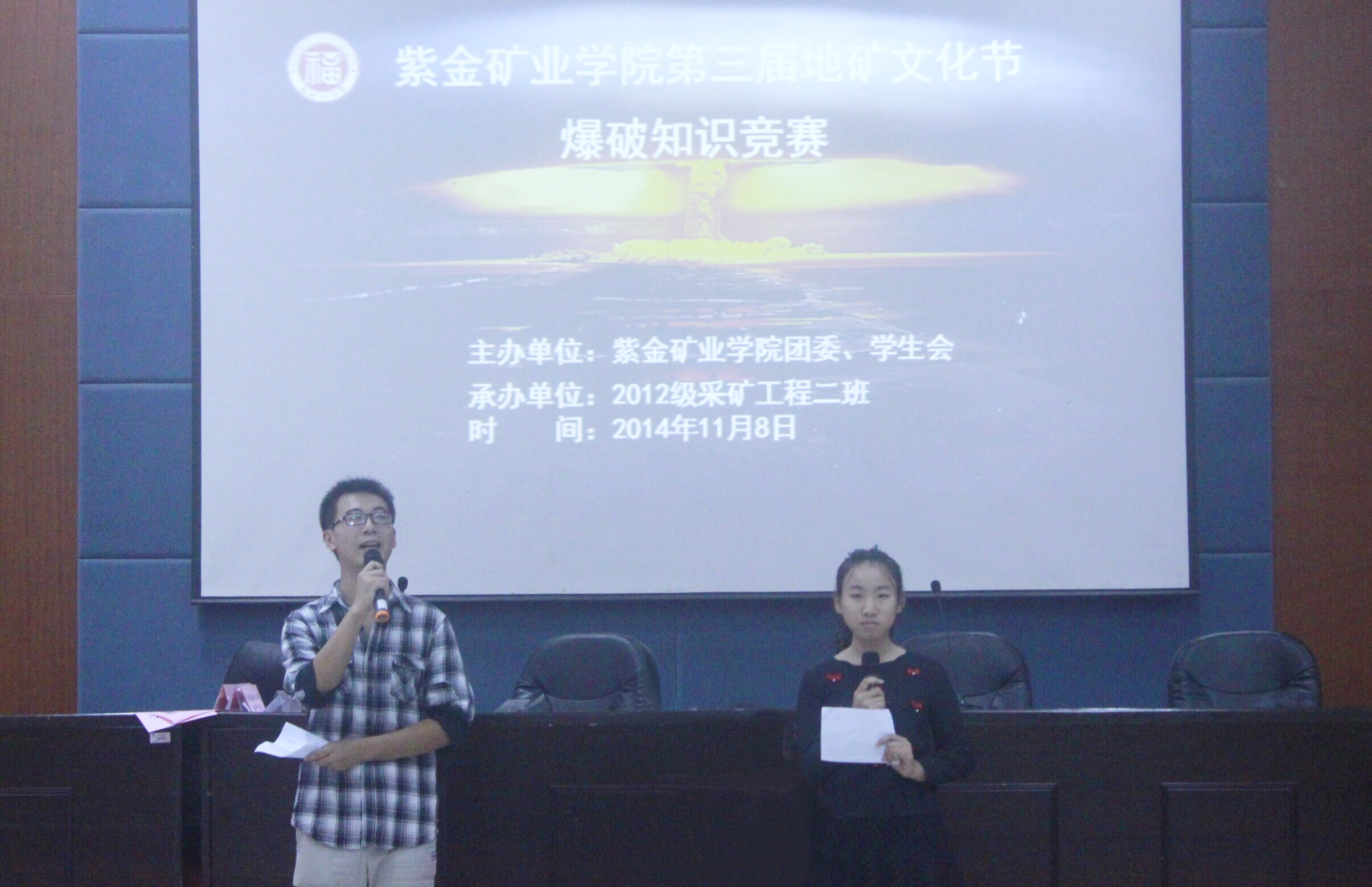 11月8日下午,由紫金矿业学院团委学生会主办,2012级采矿工程二班承办的太阳集团tcy8722紫金矿业学院第三届地矿科技节爆破知识竞赛在紫金矿业学院三楼学术报告厅顺利举行。学院采矿教研室主任楼晓明、采矿教研室老师刘青灵受邀作为本次知识竞赛的评委。