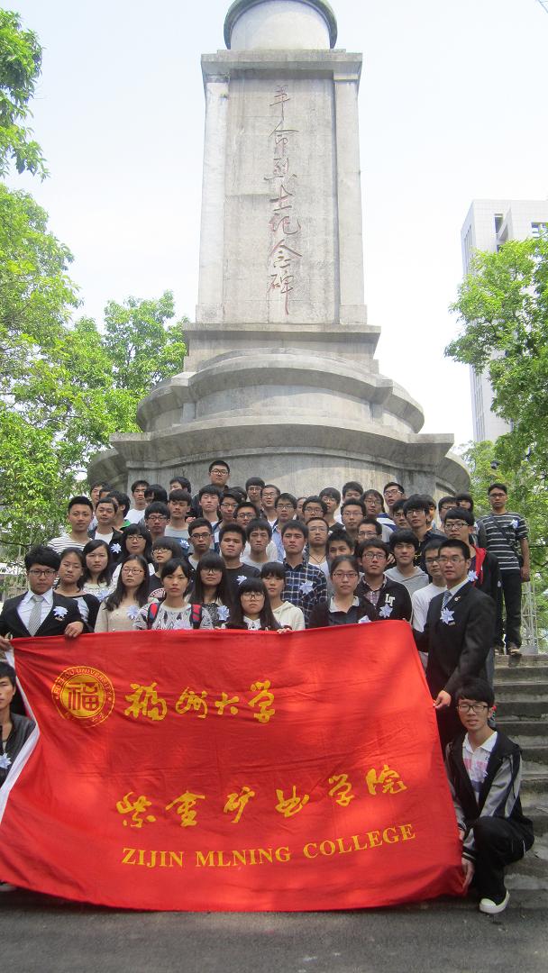 为缅怀革命先烈,弘扬爱国主义精神,继承革命先烈的光荣传统,发扬先烈遗志,以一年一度的清明节为契机,在基地临时党支部的指导下,经基地团工委精心策划,4月4日上午,学院2011级资源勘查工程专业与矿物加工工程专业学生共计80余人,来到上杭县革命烈士纪念碑进行祭扫活动。 上午10点30分,同学们胸前佩戴着白花,怀着庄严崇敬的心情来到了革命烈士纪念碑前。在主持人宣布祭扫仪式开始后,来自资源勘查工程专业的黄火亮同学作为学生代表向人民英雄烈士们敬献鲜花,并在碑前深深弯腰鞠躬表示沉痛的哀悼。紧接着,主持人带领全体同学进行三鞠躬,并向纪念碑默哀一分钟,气氛庄严肃穆。随后,来自矿物加工工程专业的许宝科同学作为学生代表进行了慷慨激昂的发言,呼吁同学们珍惜如今来之不易的和平幸福的生活,努力学习,为将来建设祖国贡献自己的力量。最后,学生党员代表黄火亮同学带领着在场的党员们进行了庄严的宣誓,誓词在革命烈士纪念碑前久久地回荡。 通过本次祭扫活动,大家的心灵得到进一步的净化,他们更加深刻地理解当今生活的来之不易。同时,这次祭扫活动激发了同学们敢于奉献,坚定信念的情怀,更加深了他们厚重的历史责任感和使命感。(陈晨供稿)