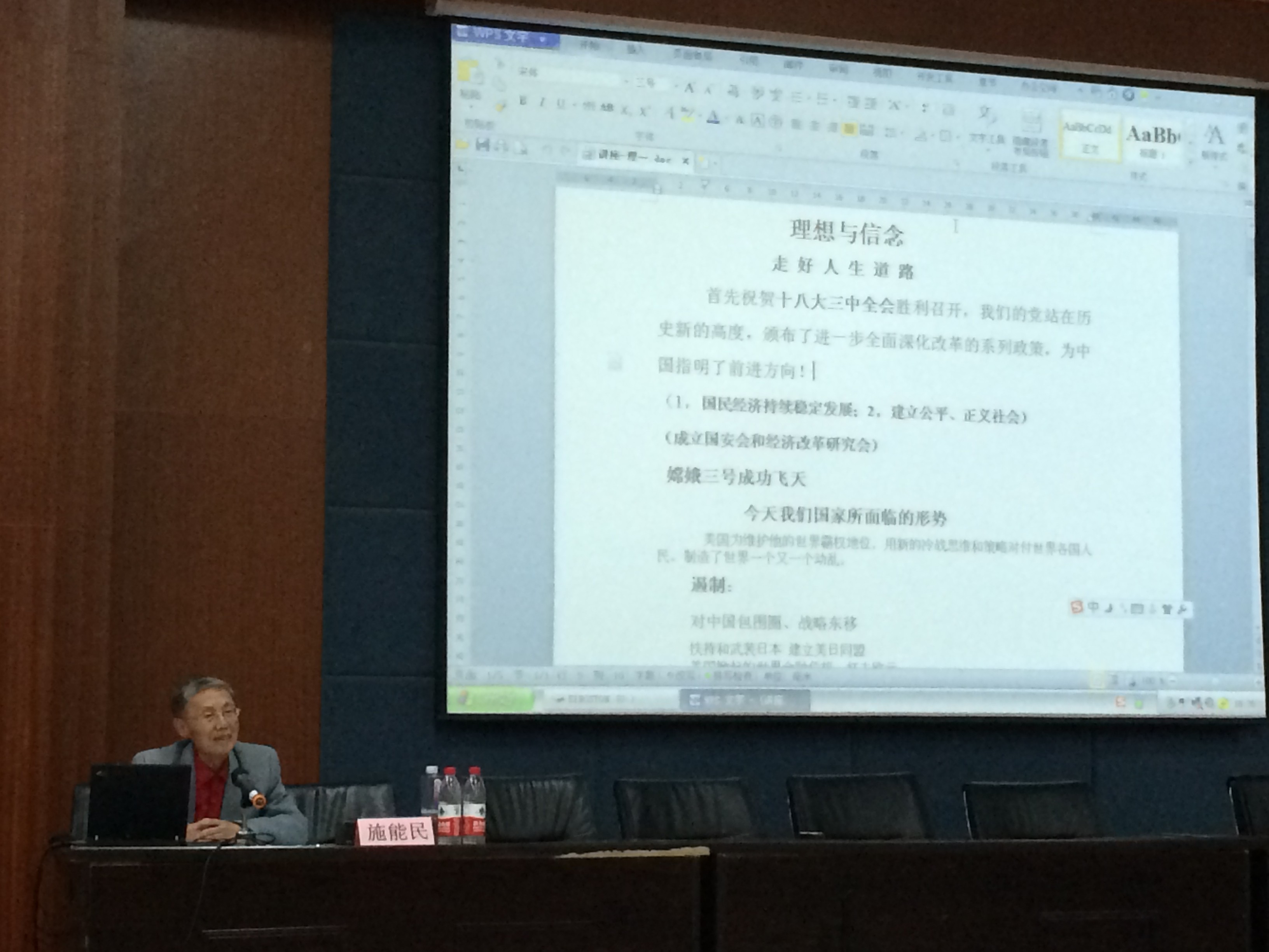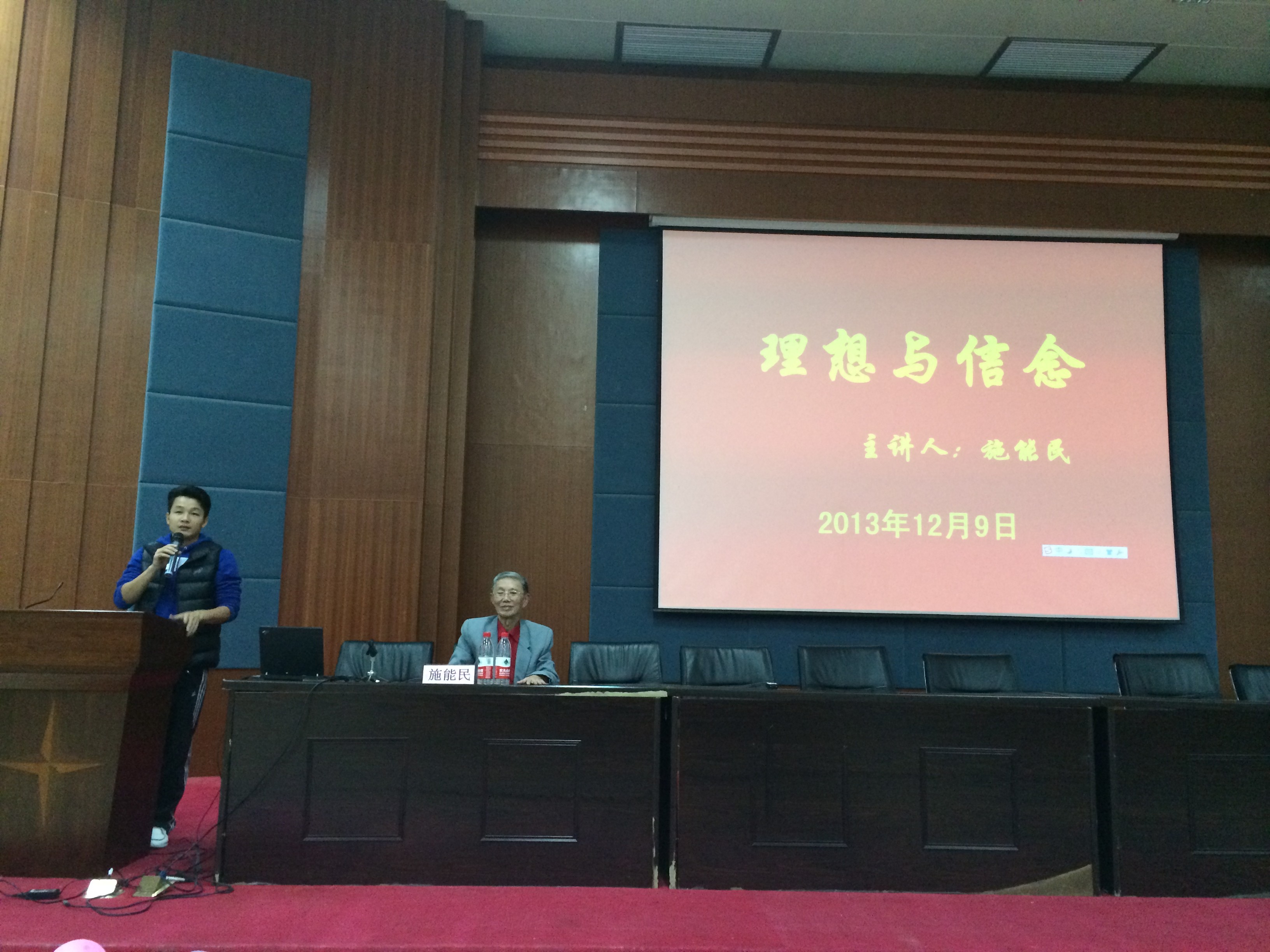 12月9日晚7:00,由我院关工委主办,院团委承办的纪念“12.9”运动78周年专题报告暨紫金讲坛第38期,在三楼多功能报告厅举行。本次讲座邀请了校老教授协会理事兼副秘书长施能民教授主讲,讲座的内容是“理想与信念”。院党委余飞副书记、辅导员李金土、翁惠玲和范新垲等老师、学院全体学生党员及2013级学生参加了本次讲座。 施教授在讲座中以十八届三中全会召开为切入点,结合自身丰富的人生经历,表达了对祖国、对党深植于心底的热爱,展现了自己如何树立、坚定理想和信念,热切期望当代大学生拥有一颗爱国之心、感恩之心,以诚信严谨的作风,努力学好专业知识,将个人的命运和祖国的命运联系在一起,用切实的行动报效祖国。最后,讲座在施教授浑厚有力的歌声及同学们热烈的掌声中落下帷幕。 本次讲座不仅给我院学子们带来了一次深刻的爱国主义教育,更启发了同学们对自身思想政治素质、专业学习、道德修养上的反省与思考,引导他们探索正确的人生信仰,树立远大的理想目标,为走好人生道路奠定了良好的基础。