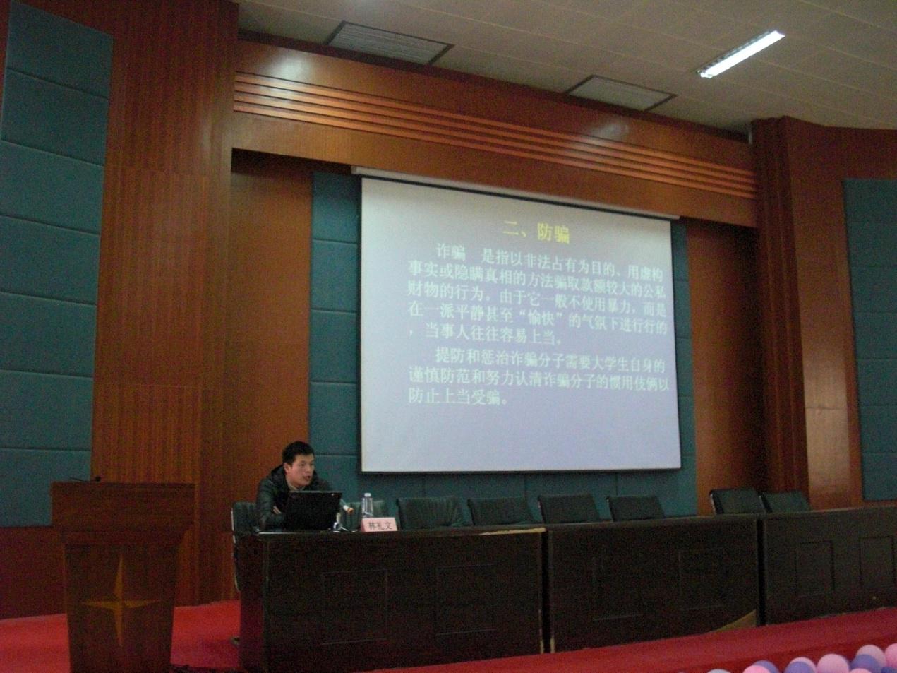 为进一步提高我院2013级新生安全防范意识,增强防火防盗防骗能力。12月12日下午2:00,新生再教育活动----“关注安全、健康成长”讲座在学院三楼学术报告厅举行。此次邀请校保卫部政保科林礼文科长担任主讲,学院辅导员范新垲老师主持,全院2013级同学参加 。 在讲座中,林礼文科长从“如何避免诈骗盗窃”和“日常安全知识”两个方面展开讲解,用生活中真实的案件作为切入点,给同学们介绍了常见的诈骗手法和偷窃行为,并传授了许多切实可行的防盗、防骗策略。之后,林科长重点就同学们日常生活中存在的安全隐患进行讲述,多次强调同学要注重日常的生活细节,逐步提高安全意识,健康快乐成长。 讲座结束后,学生们在保卫部老师的带领下来到学院大楼边的空旷场地,在校保卫部彭老师的统一指挥下,同学们亲身体验了如何使用灭火器,怎样消除火灾隐患。 此次活动很好贯彻了“在实践中学习,在好奇中成长”的教育理念,大大增强了学生的安全防范意识,取得了显著的效果。(罗 瑞 曾丁伟 王振昌 供稿)